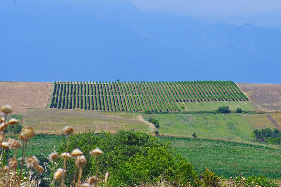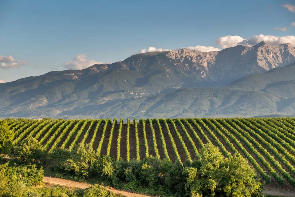 A privately owned organic vineyard is located in an altitude of 300m between the volumes of Mt. Olympus and Mt. Pieria. The plots are calcium-rich slopes of sand-chalk and chalk-clay consistency and produce wine of exceptional finesse and rich aromas. The microclimate is classed as alpine-continental, with very cold winters, intense rainfall in spring, and cool summers due to proximity to the sea.